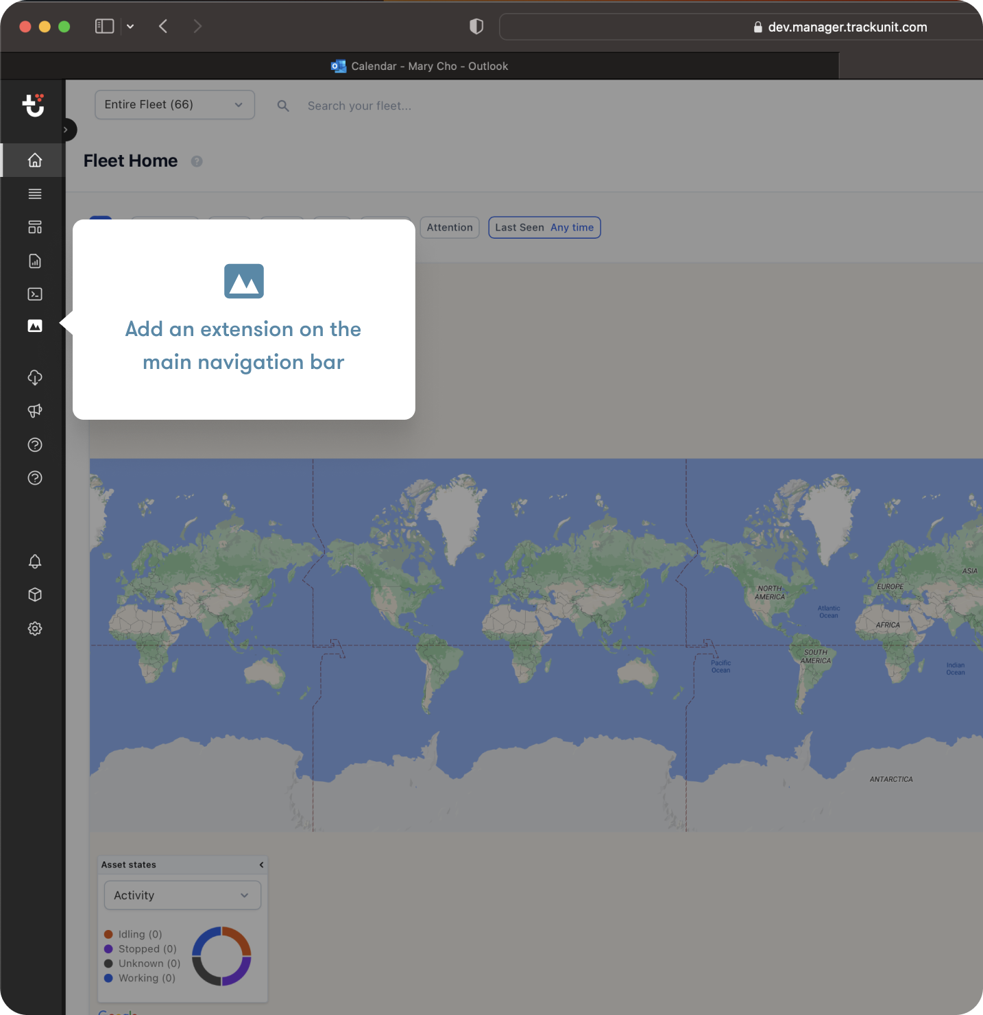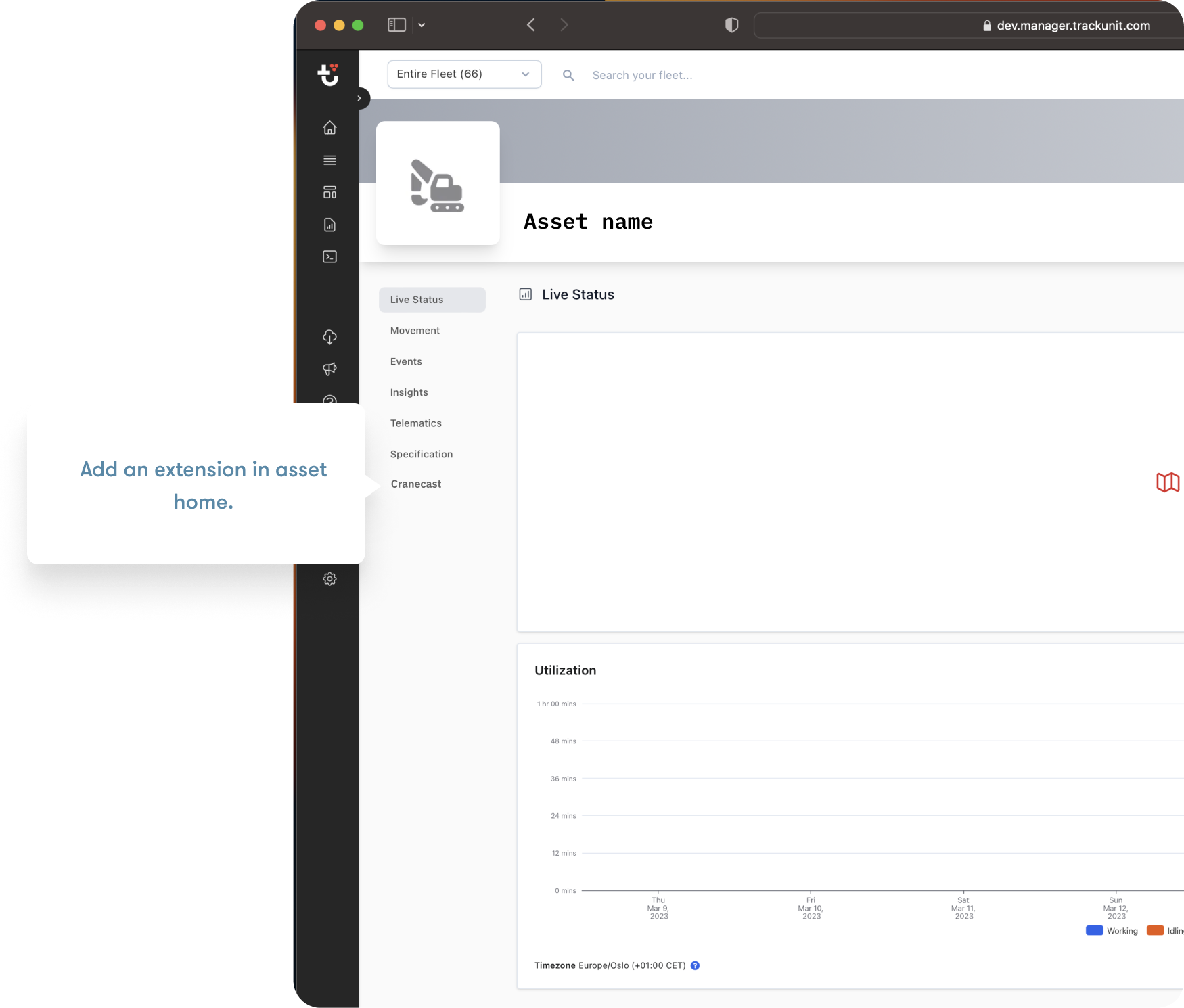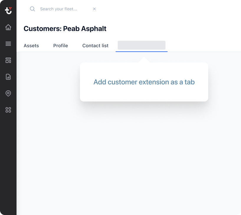This extension point allows you to add a new tab to the Assets Home screen within Trackunit Manager, as illustrated in the image below. The extension is controlled in the extension-manifest.ts file.