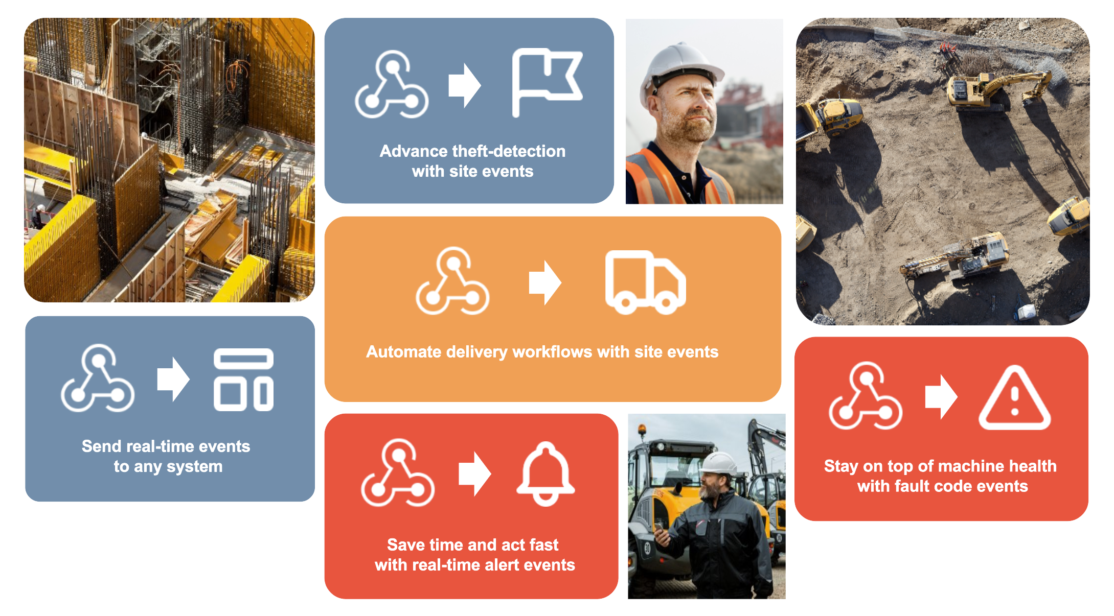 In the bustling world of construction, staying on top of equipment maintenance is crucial for keeping projects running smoothly. Via webhooks you can include alert events seamlessly in your digital workflows, so that operational alerts such as low battery levels or fuel levels can instantly be shown in the systems that are used on-site. Ensure that relevant people are notified in your system of choice and empowered to act upon the alert, therefore addressing issues before they escalate.